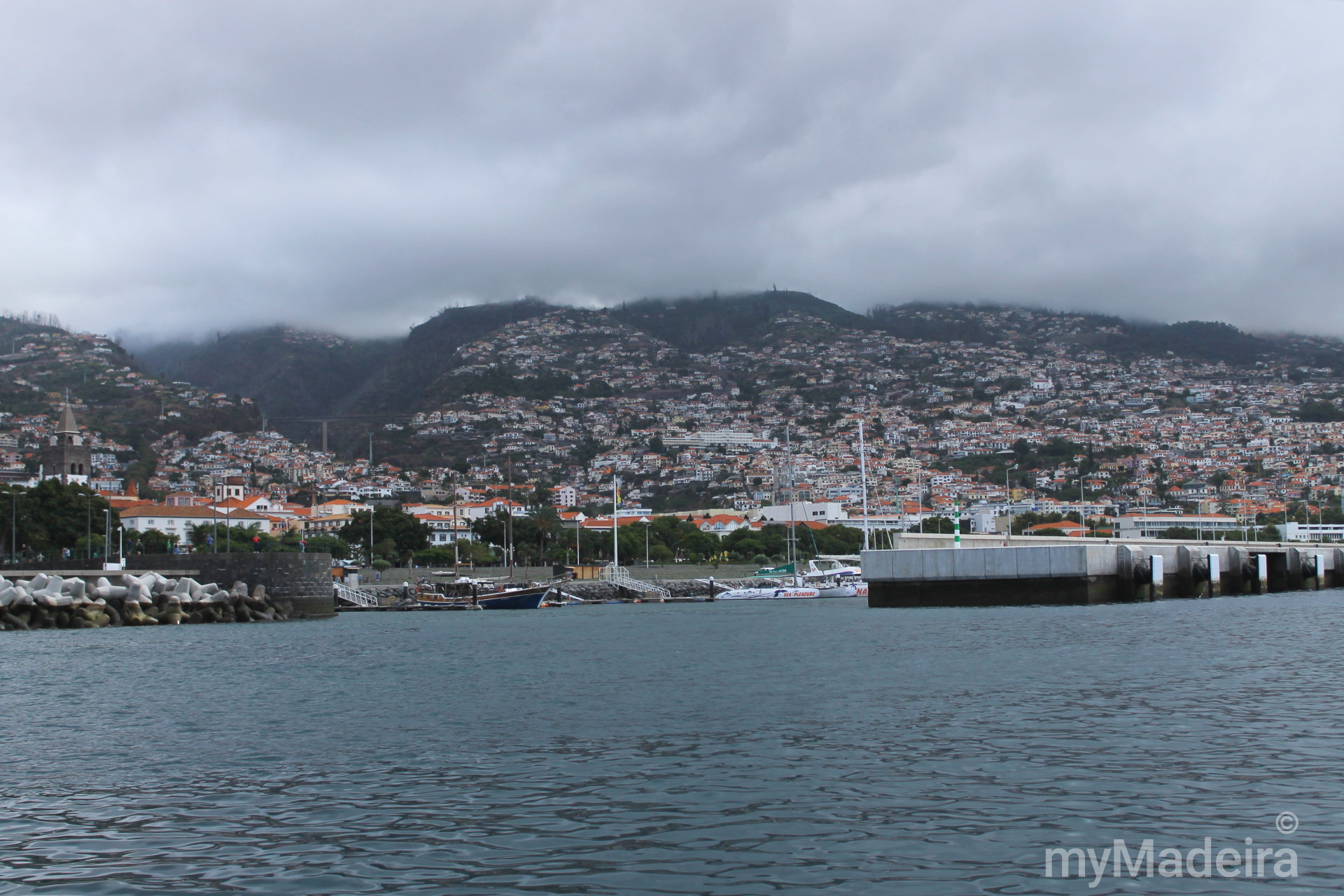 A pihenő után közel a parthoz elindultunk vissza a kikötőbe. Elhajóztunk Câmara de Lobos, majd a funchali szállodanegyed mellett is. Ebből a perspektívából nagyszerűen látszik, hogyan épült be az egész hegyoldal. Kicsit szomorú volt látni az épületeket egymás hegyén-hátán, ahogy lassan teljesen felemésztik ennek a gyönyörű szigetnek a természeti kincseit.