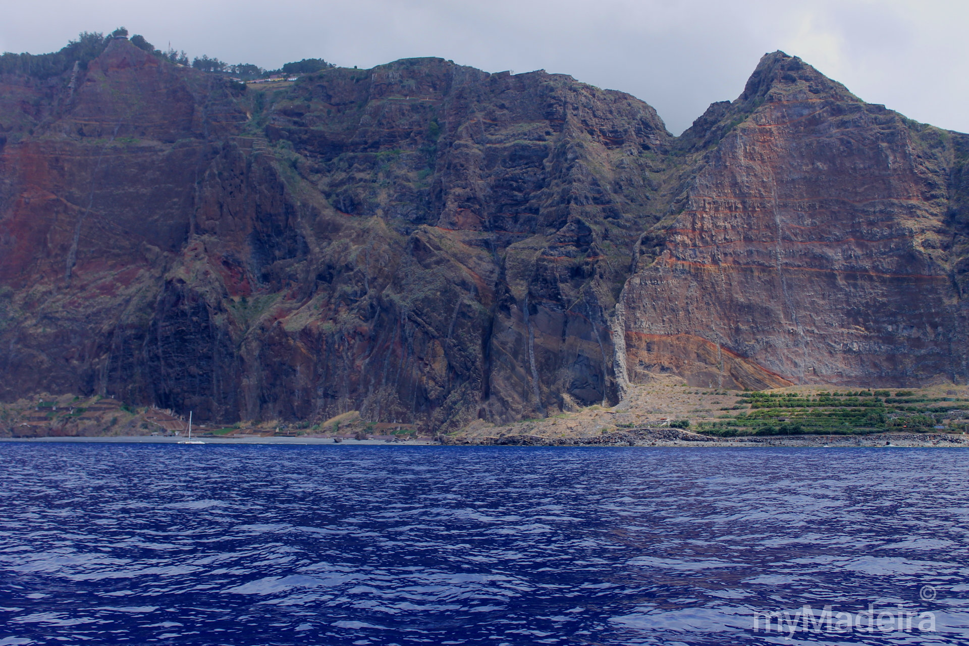Miután búcsút intettünk a delfineknek a part felé vettük az irányt. Mivel először voltunk a szigeten, pontosan nem tudtam, hogy hol vagyunk és a mai napig is csak sejtem, hogy valahol a Cabo Girão környékén lehettünk, mikor egy fél órás pihenőt tartottunk. Itt a hajó legénysége leeresztette a horgonyt, leengedtek egy létrát a vízbe és a bátrak lemehettek úszni. Sajnos ez az a rész, ami nekünk abszolút no go. Ugyanis annyira magabiztosan egyikünk sem tud úszni, hogy kimerészkedjünk a nyílt óceánra, ahol több tíz, vagy akár több száz méteres mélység húzódhat alattunk. Vágytunk rá, hogy kipróbáljuk, nagy volt a kísértés, de végül győzött a józan ész, tisztában vagyunk a képességeinkel. Imádjuk madeirát, de azért a fogunkat nem akartuk ott hagyni.