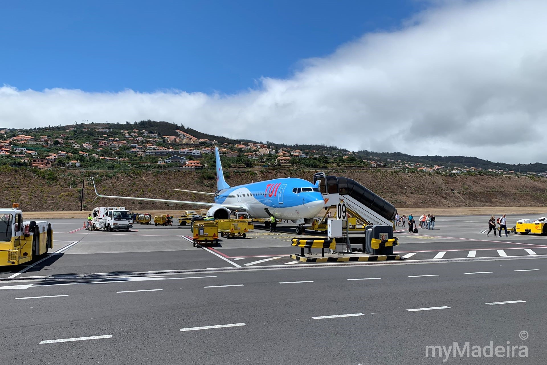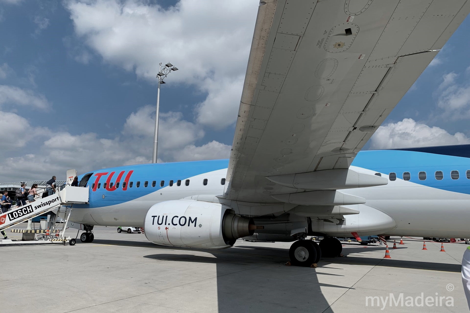 A TUIfly Deutschland az egyik Boeing 737-86N típusú gépével teljesítette ezt az útvonalat. Végre eljött a várva várt pillanat, megkezdtük a gurulást a termináltól, majd rövid taxizás után eljött a felszállás pillanata. Egy utazási irodán keresztül foglaltuk a nyaralásunkat életünkben először és valószínűleg utóljára. Az első negatívum ezzel kapcsolatban már a repülőn érezhető volt. A repülőjegy az árban volt, de helyjegyet foglalni nem volt lehetőségünk. Őszintén szólva nem is gondoltunk rá, valahol a mi hibánk is. Ennek a hibának köszönhetően a folyosó mellett kaptunk helyet, igaz egymás mellett, de nem az ablaknál. Így a repülőútból nem sokat láttunk, amit főleg az Alpok felett és a leszálláskor sajnáltunk. Az út München és Madeira között nagyjából négy óra. Ereszkedéskor még nem sejtettem, hogy életem legfélelmetesebb leszállásában lesz részem. Az idő igen szeles volt és ez a szél észak felől fújt, melynek köszönhetően a trükkösebb 05-ös volt a leszállóirány. Ez azt jelenti, hogy gépünk először elrepül a leszállópálya mellett, majd egy 180 fokos éles fordulóval, amit a pilóták már kézzel repülnek, folyamatos ereszkedés mellett közelítjük meg a 05-ös futópályát. Az erős szélnek köszönhetően és valószínűleg annak is, hogy nem igazán láttam, mi történik, erősen úgy éreztem, hogy egy hullámvasúton ülök. Persze mondanom sem kell, a pilóták profin tették a dolgukat és talán az erős hátszélnek is köszönhetően helyi idő szerint (mert Madeirán egy órával kevesebb van) 16 órakor, kevéssel korábban a tervezettnél, megérkeztünk a Santa Cruzban található Christiano Ronaldo Nemzetközi Repülőtérre.