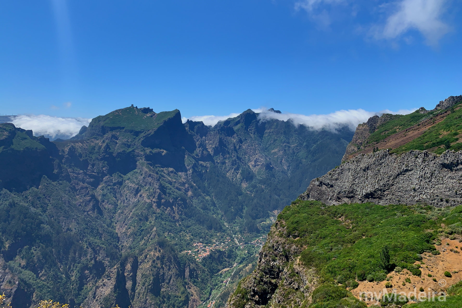 Elkezdtük tehát a PR1-es túrát. Az útvonal 6,1 km hosszú, 3,5 órás. Ez egy irány. Sokan úgy csinálják, hogy elindulnap mondjuk az Areeiro-ról, megérkeznek a Ruivo-ra és onnan még elsétálnak a PR1.2-esen az Achada do Teixeira-hoz, ahol a Ruivo parkolója található, és onnan visszataxiznak az autójukhoz az Areeirora. Mi úgy döntöttünk, oda-vissza legyalogoljuk az utat. Legalábbis ez volt a tervünk. Sajnos azonban nagyjából félútnál vissza kellett fordulnunk, mert Zsófi nem érezte jól magát. Az egész nyaralás alatt gyengélkedett, -valószínűleg a repülőn fázhatott meg- viszont itt, ahol komoly fizikai erőnlétre van szükség, sajnos fel kellett adnunk a túrát. Az út viszont, amit sikerült megtennünk gyönyörű volt. Az első néhány kilométeren csak ereszkedtünk be a völgybe. Azoknak akik tériszonnyal rendelkeznek, már az első pár száz méter is komoly kihívást jelenthet. Egy gerincen kell végighaladni, melynek két oldalán szédítő mélység tátong. Az első kilátópont a Miradouro do Ninho da Manta, ahova érdemes kitérni, ugyanis gyönyörű a kilátás az Areeirora és a környező völgyekre. Ezután lépcsőkön és sziklák oldalába vájt utakon haladunk az első alagúthoz, ami a Pico do Gato-n megy keresztül. Ez egy igen hosszú és sötét alagút, fejlámpa használata erősen ajánlott. Majd tovább ereszkedünk, néhol igen meredek lépcsőkön visz az út csodálatos tájakon át. Mi ebben az évben a Pico das Torres lábáig mentünk, itt fordultunk vissza. Kicsit csalódottak voltunk, de megbeszéltük, hogy a következő alkalommal ez lesz az első túra amit Madeirán végigcsinálunk. Visszafordultunk tehát a szakasz talán legalacsonyabban lévő pontjáról, hogy újra felmenjünk az Areeirora. Nagyon meleg volt aznap, ez már eleve sokat kivett belőlünk, így az utolsó kilométerek már nagyon nehezen mentek. Miután megérkeztünk, természetesen már rengeteg hely volt a parkolóban, nem úgy mint reggel. Visszasétáltunk a kocsihoz és elindultunk az Apácák völgyébe. Egy következő évi blogban sokkal részletesebben le fogom írni ennek a csodálatos útvonalnak az élménybeszámolóját, mivel ebben az évben ezt nem csináltuk végig, túl sok minden maradt volna ki.